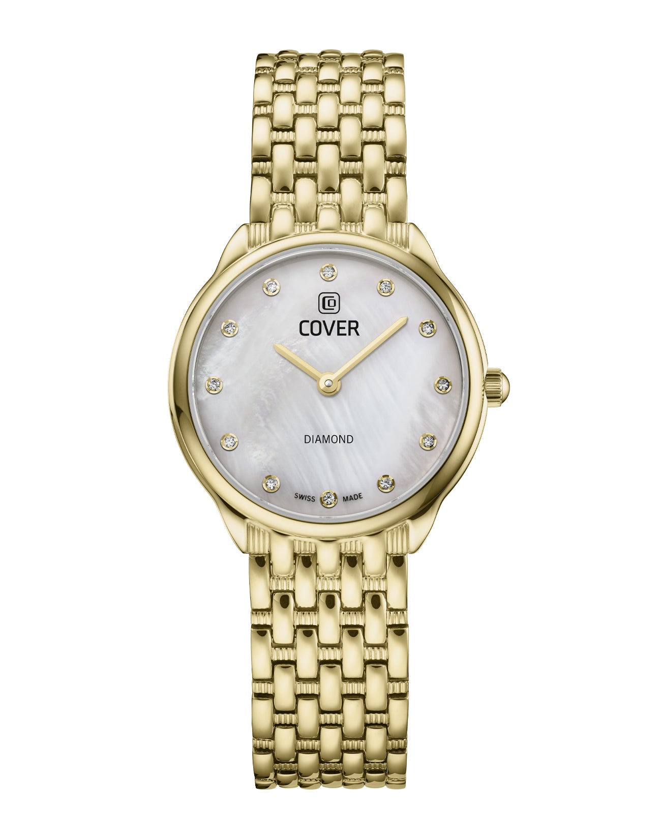 The COVER Eternal Pearl Diamond Ladies Watch embodies Swiss elegance and golden sophistication. Its white mother‑of‑pearl dial glows softly, illuminated by twelve real diamonds. The polished gold‑tone case and bracelet add warmth and radiance, creating a refined presence that shines beautifully with evening wear.