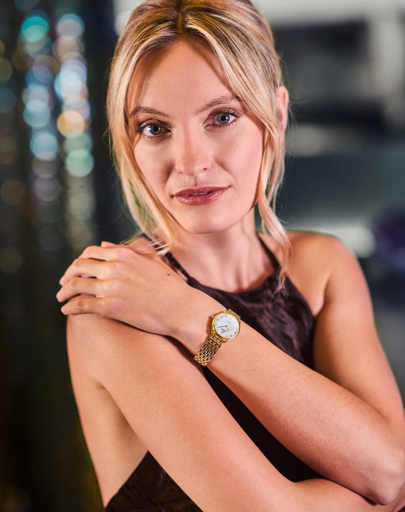 Finally, this women’s diamond watch adds golden light and elegance to every gesture. In addition, the way it catches the light against an evening dress makes it the perfect piece for modern women who love timeless luxury. Indeed, the Eternal Pearl shows how Swiss precision and elegance can shine together.